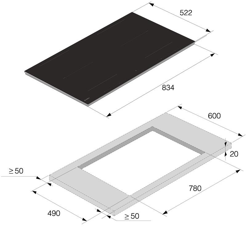 Габаритные размеры (Ш/Г/В) 834/522/196 ммРазмер ниши (Ш/Г/В) см схему ниже